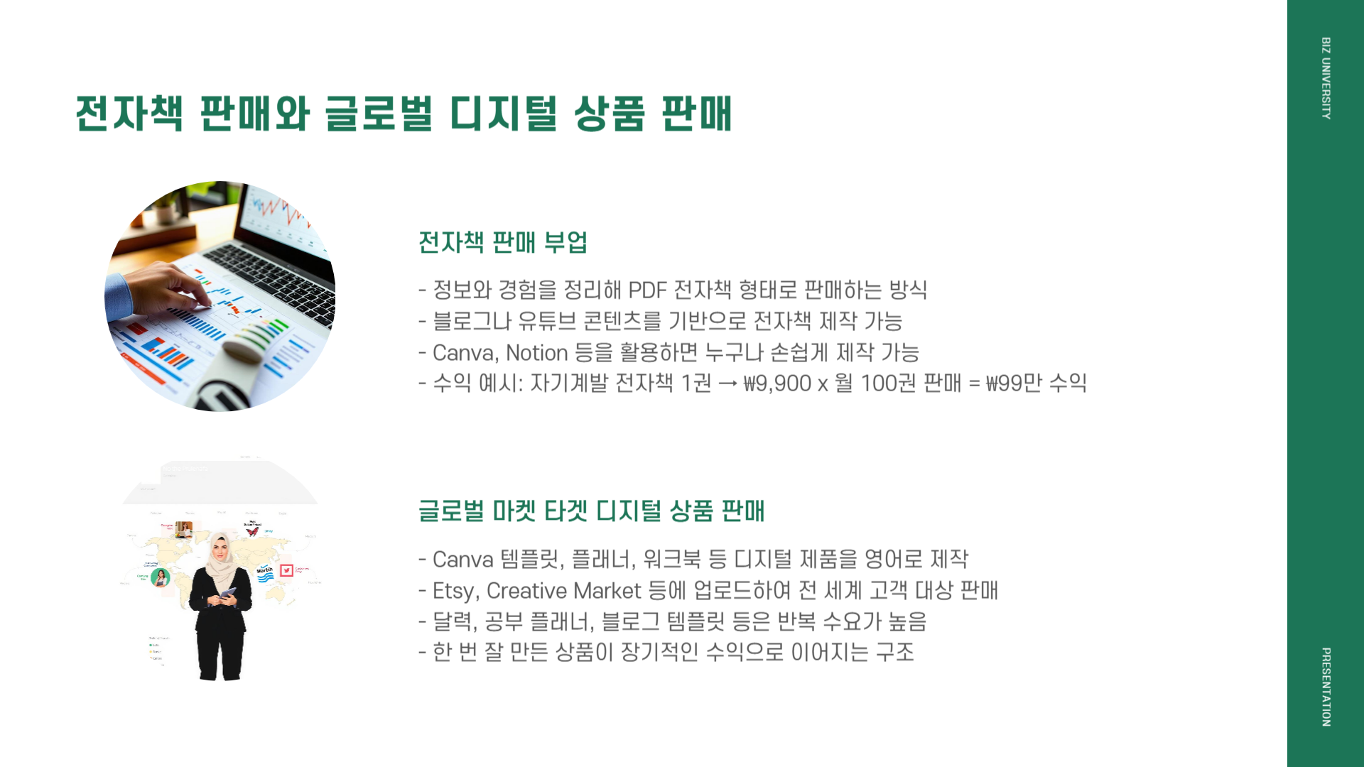- 자기계발 전자책 1권 → ₩9,900 x 월 100권 판매 = ₩99만 수익